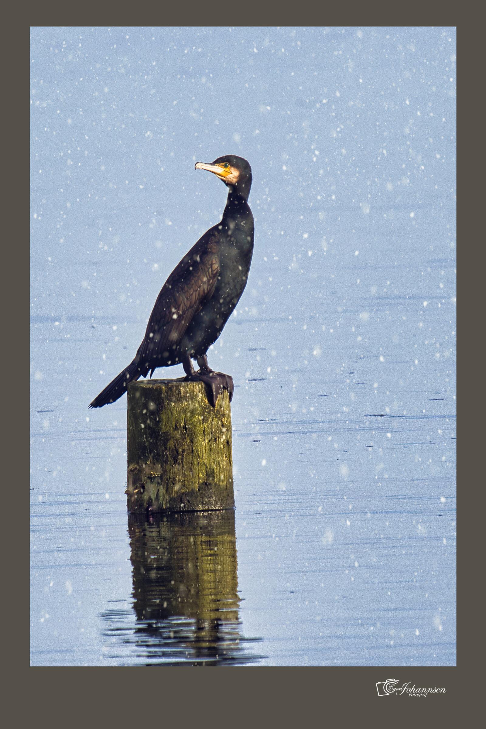 Skarv i solskin og snevejr.