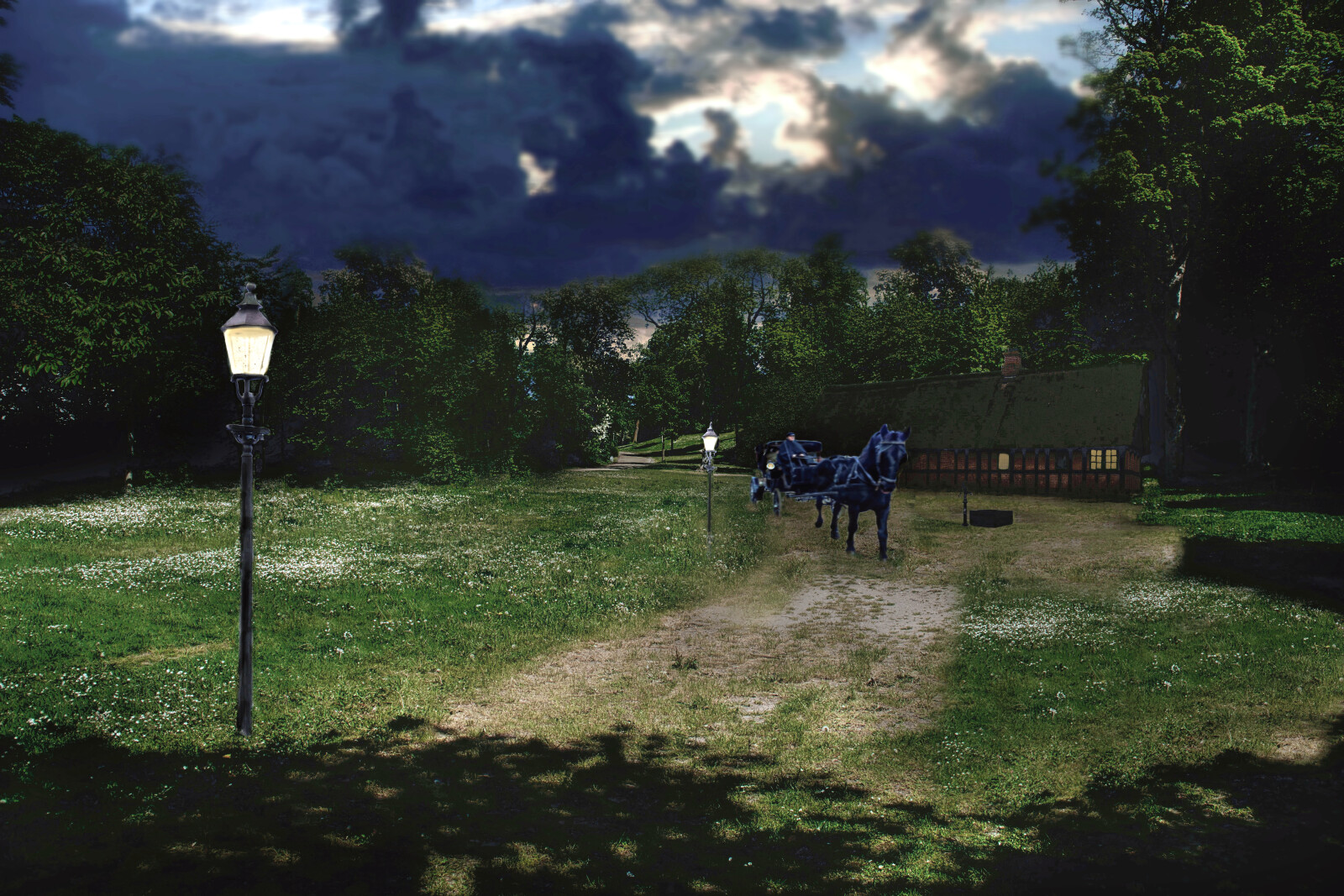 det er et aften motiv.lagt sammen af flere billeder.så stedet findes ikke det er ren fantasi.det er ikke 100 procent, men et sjov motiv