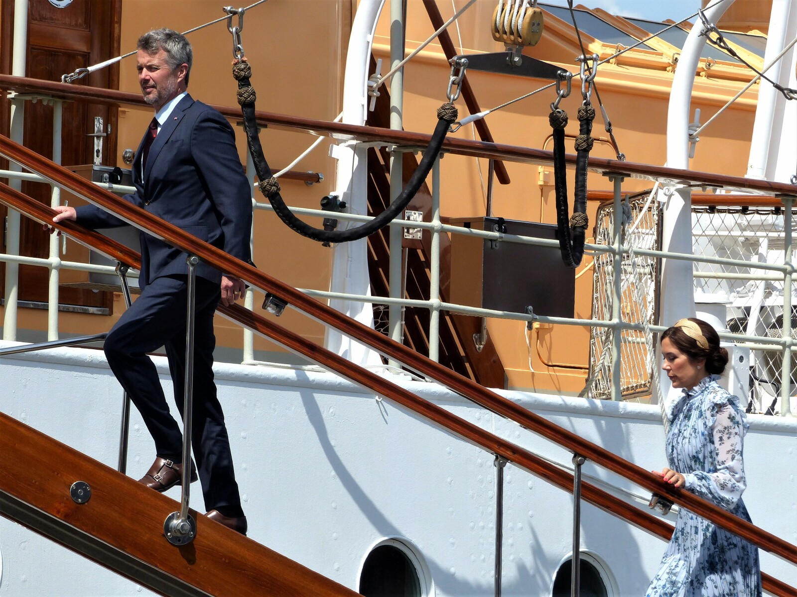 Så kom kronprins Frederik endelig til tops. Her ses han på vej op ad lejderen til kongeskibet Dannebrog under et besøg i Aarhus i juni. Den kommende dronning, Mary, holder passende afstand.