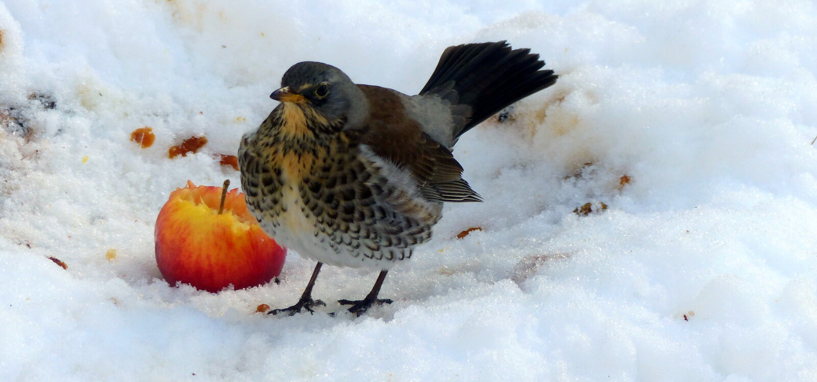 Sjaggeren har invaderet haven og kæmper nu en indædt kamp mod solsorten om foderæblerne.
