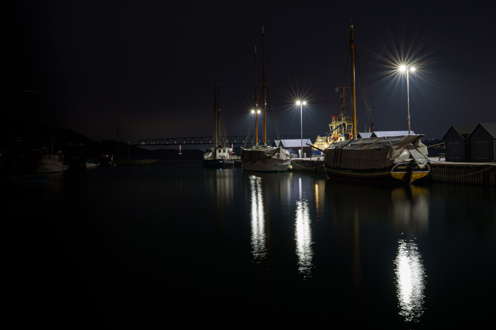 Den gamle fiskehavn i Middelfart med den gamle Lillebæltsbro i baggrunden