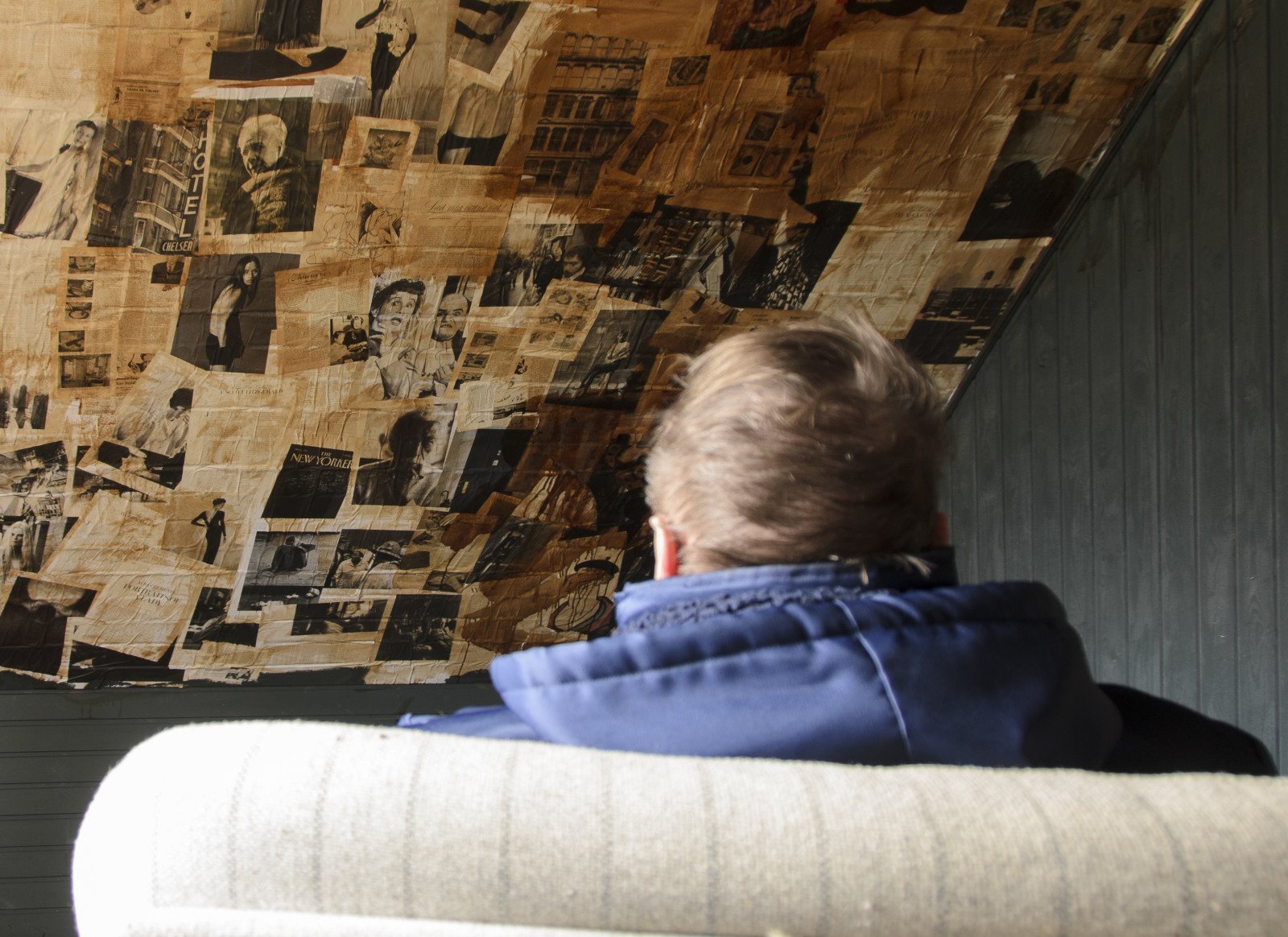 i hovedhuset var der et rum hvor begge loftsidder var dækket af gamle aviser billeder