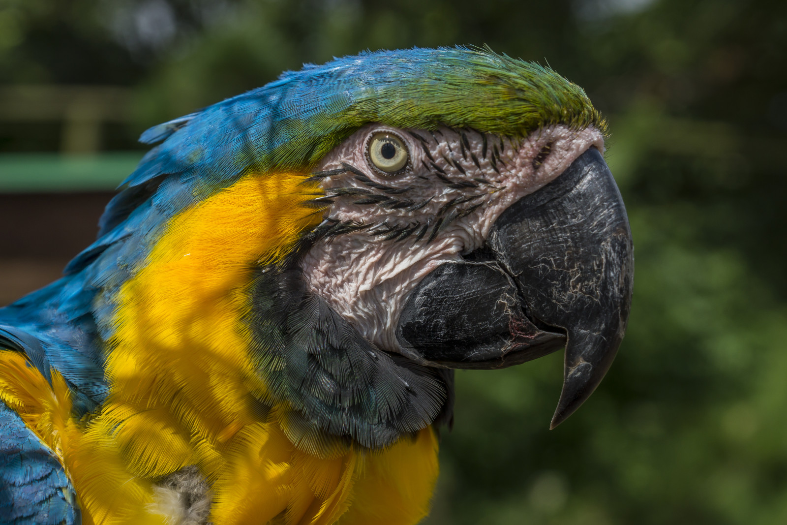 Closeup af en Blågul ara, umiddelbart lige før den bed i mit optik (dog uden at lave ridser).
