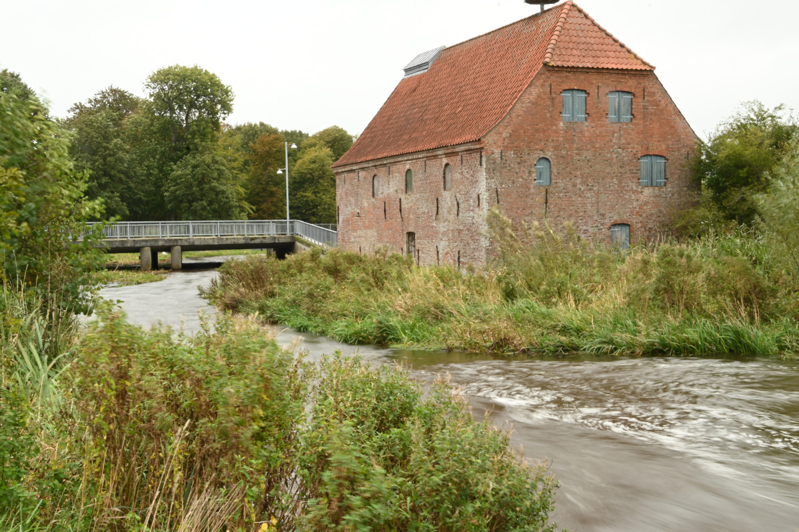 Masser af vand i Vidåen her ved Bachmanns Vandmølle i Tønder. Den bliver brugt til koncerter under Tønder Festivalen. Det var her Festivalen startede i 1974 og stedet blev hurtigt døbt "Visemøllen"